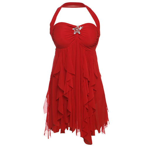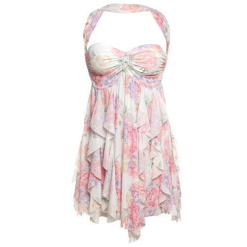 Ins Halter Neck Backless Dress Printed Irregular Mesh