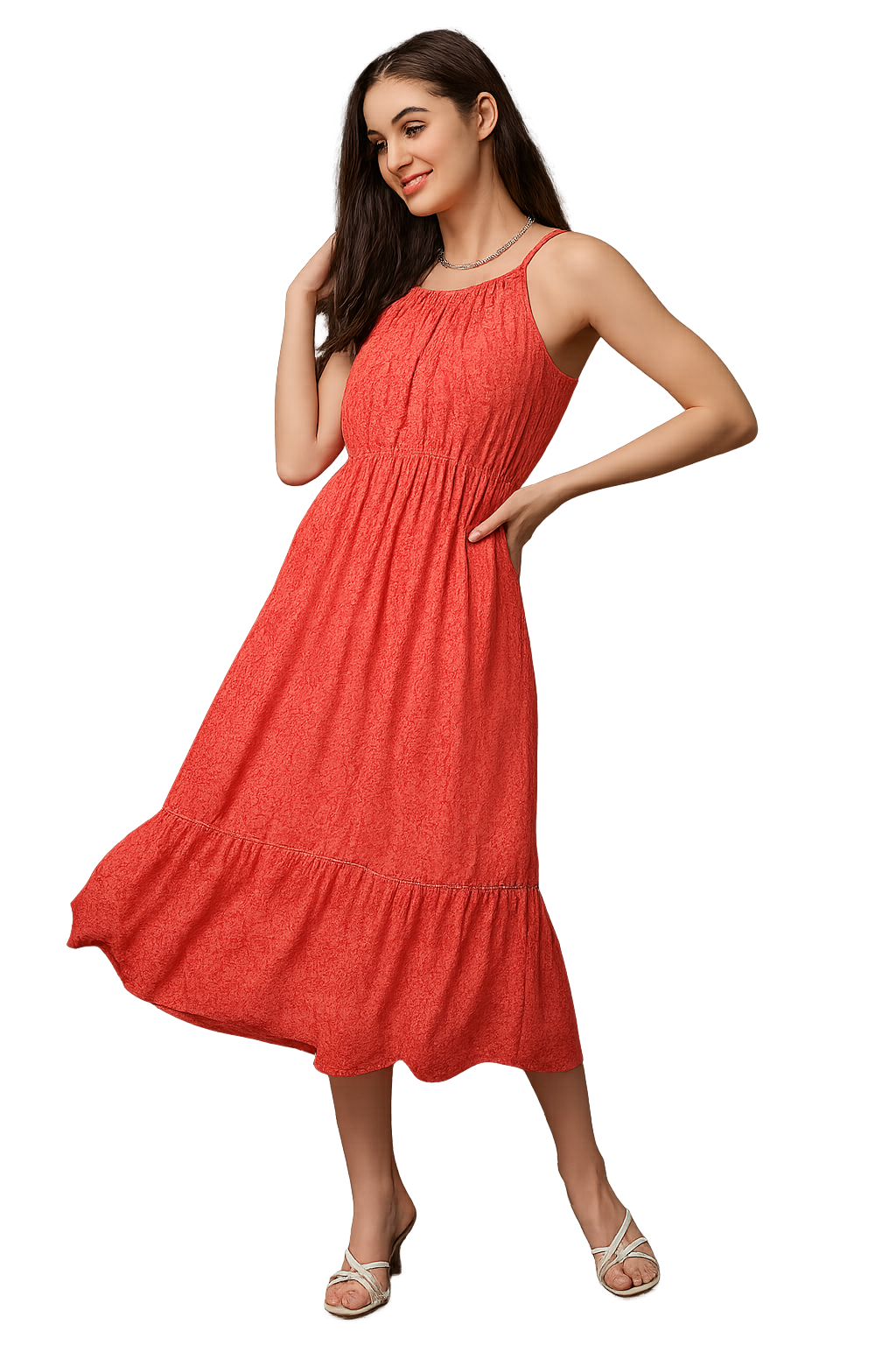 Add a splash of elegance to your wardrobe with this sleeveless midi dress, designed for effortless style and comfort. Featuring a flattering A-line silhouette and a gathered waistline, this dress enhances your natural shape while offering a relaxed fit. The ruffled hem adds a playful touch, and the soft, breathable fabric makes it ideal for warm-weather outings. With thin shoulder straps and a classic round neckline, this dress transitions seamlessly from beach days to brunch dates.
